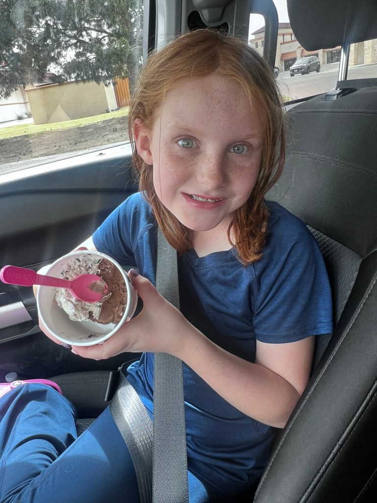 Little Red’s eating habits went from full vacuum to only eating what felt good in her mouth, now that her retainer is out, her choices have improved but there are still things she LOVES that feel great on her teeth; see picture posted above, and to her credit, who wouldn’t take advantage of ice cream?